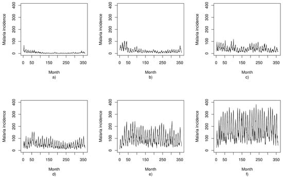 Six different simulations of malaria incidence using different scenarios of gametocytemia, specifically, (a) 63 days (), (b) 68 days (), (c) 70 days (), (d) 75 days (), (e) 90 days (), and (f) 110 days of positive gametocytemia over 150 days of expected disease duration (i.e., ).