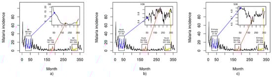 The procedure is illustrated in Figure 3 and is as follows. We define a 36-month moving average malaria incidence, symbolized as , at month m, as the average malaria incidence in the previous 36 months: