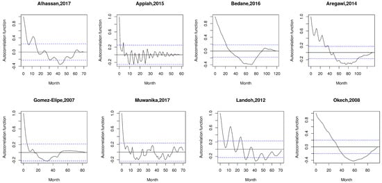 Malaria empirical series: Autocorrelation function from Alhassan et al. (Kasena Nankana municipality in Ghana, 2017) [21]; Appiah et al. (Ejisu-Juaben municipality in Ghana, 2015) [16]; Bedane et al. (Kucha district in Ethiopia, 2016) [23]; Aregawi et al. (Ethiopia, 2014) [22]; Gomez-Elipe et al. (Karuzi in Burundi, 2007) [24]; Muwanika et al. (Uganda, 2017) [26]; Landoh et al. (Est Mono district in Togo, 2012) [25]; Okech et al. (Kenya, 2008) [27].