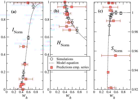 Figure 6 repeats the models drawn for the simulations of the agent-based model, together with the estimate for the eight empirical series. While malaria incidence and the Hurst exponent retrieve reasonably acceptable predictions, the entropy seems to be very sensitive. The reason for this may be related with the fact that the values of the entropy are all very similar, making difficult to derive a numerical model that distinguishes between the different values. Moreover, the errors are typically large, showing a broad range of different predictions depending on which models are used (cf. Equation (9)).