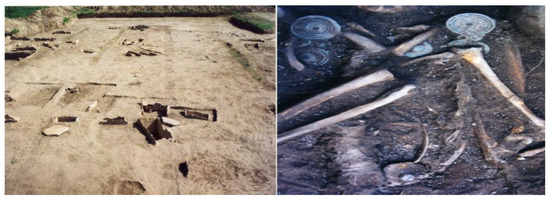 An ancient cemetery with 50 cist graves (Figure 1) from the Early Iron Age has been excavated in Agras, 4 km west of Edessa in Macedonia, northwest of the Edessaios River, a place where habitation traces from as far back as the Neolithic Age have been found [59]. The graves were in groups, without any other elements that could allow their identification, like a family tumulus, whereas their existence is not excluded. Some of them were empty due to the intensive arboriculture of the area since the 1950s, while others were small, as an indicator of the individual’s age. The tombs present the well-known image of the Iron Age cist graves, in which the slabs of the long sides protruded in order to securely hold in place the narrow ones. Many of the tombs included primary and secondary burials as well as older ones; usually the skulls were gathered at the same narrow side. Inside, iron weapons, bronze jewels and clay pots were also recovered.