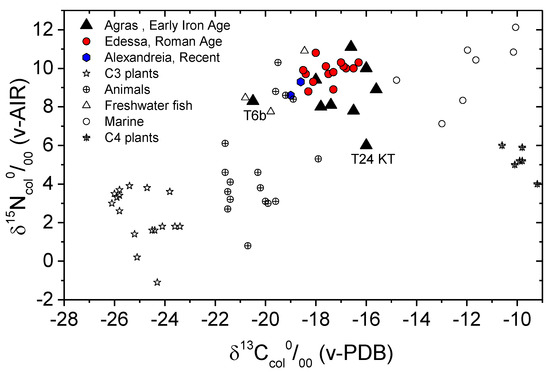 In addition, we observed that the results from Agras (EIA) were in good agreement with the ones of Edessa (Roman) (t-test for δ13C: t = 0.94, p = 0.36 and for δ15N: t = 1.92, p = 0.08), as well as the ones of Alexandreia (recent) (t-test for δ13C: t = 1.62, p = 0.13 and for δ15N: t = 0.08, p = 0.93). The much enriched δ13C isotopic values, together with the enriched δ15N values, indicate a combined terrestrial diet of mainly C3 and secondary C4 diet, like millet, in combination with freshwater fish consumption. Probably, the C4 diet was mainly introduced by the consumption of animals fed with millet and secondary as a direct food source. The elevated nitrogen value, 8.8‰, indicates that legumes were not a significant part of the diet as their δ15N values range between 0‰ and 2‰ [79]. Additionally, their isotopic values do not reflect a marine diet, a result consistent with the site location, i.e., far from the sea. Moreover, the sample T24-KT, which exhibits the lowest δ15N value, 6‰, reflects a diet of C3 and C4 with a minimal animal protein contribution. On the contrary, sample T6b has a very negative δ13C isotopic value, −20.5‰, which indicates no C4 contribution to the diet. Both of these individuals were buried with their arms bent at the elbow and raised to the shoulder, which is an uncommon posture and may have had some ritual significance [59].