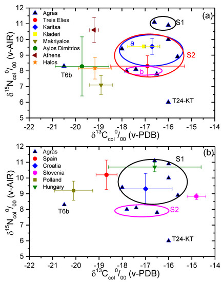To compare with the other European sites, we performed a t-test and our samples were separated into two groups (Figure 3b): the first was group S1, which had no significant difference for δ13C (t = 0.50 p = 0.64) and for δ15N (t = 0.07, p = 0.95), with the site in Croatia having isotopic values that indicated a mixed C3 and C4 diet [63] and the one in Hungary showing elevated nitrogen values that might be due to the incorporation of freshwater fish or to differences in agricultural techniques [66]. The second group is S2, which differed insignificantly in Croatia and Hungary for δ13C (t = 0.85 p = 0.46), but for δ15N the difference was significant (t = 3.84, p = 0.03). However, the results of both groups did not agree with the ones of Slovenia, where the C4 contribution was greater than that of C3 [65] and Poland, where, unlike in Agras, there was no evidence of C4 diet [64]. Moreover, in Spain, C3 in the diet outweighed C4, which is more significant to infants’ diet [62]; this was in contrast to Agras, where the C4 contribution was quite evident. The rest of our samples, i.e., T6b and T24-KT, had carbon and nitrogen isotopic values different from the other European sites.