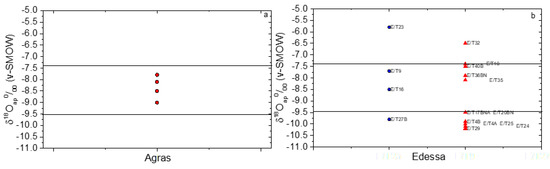 The differences in δ18Ow isotopic values of ingested water between individuals in (a) Agras and (b) Edessa. The red dashed lines indicate the isotopic range of the waters of the area. In (b) the filled blue circles indicate men and the open triangles indicate women.