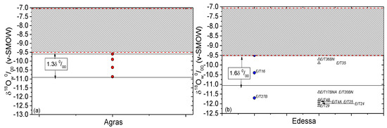 Additionally, the population of an ancient city could get water from sources of different altitudes; therefore, the δ18Ow of water springs were correlated to the climate data and the geographic spread of ancient cities in order to define the isotopic fingerprint of the areas. The annual precipitation rate for the area of Edessa (Agras and the city of Edessa) is 500 mm, with a mean annual temperature of 12 °C; however, it exceeds 750 mm in regions of higher altitude (mountainous areas: Vermio and Voras-Kaimaktsalan Massif reach 2000 m and 2500 m, respectively). In order to take into consideration the relationship between δ18Ow and altitude, an oxygen isotopic analysis was conducted for water sources (eight springs in the area near Agras and Edessa) at different altitudes of the regions (δ18Ow) (Figure 4) and the results were combined with those presented in Dotsika [19]. The local/specific gradient of oxygen isotope value versus altitude (δ18Ow = a × Altitude + b) is: