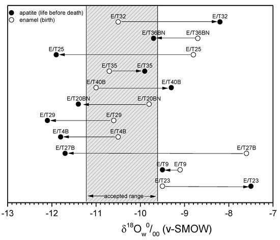 Hence, these out-of-range individuals from Edessa must be examined separately. The isotopic signature recorded in the permanent teeth reflects the water consumed early in life, while that recorded in the bones reflects the water consumed during the last 10–20 years of life. Therefore, the oxygen values of enamel show the climate in the region they were born, while the oxygen values of apatite show the climate in the region where the individual lived before his/her death. In Figure 7 we present the results of oxygen apatite and enamel for each sample.