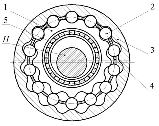 Cross-section of a transmission with intermediate rolling elements and a free cage: H—generator; 1—cam; 2—intermediate rolling elements; 3—ring; 4—cage; 5—bearing.
