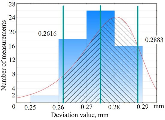 After measuring the root diameters of the cycloid profiles of wheels manufactured by the OOO “Siberian Engineering Company”, it was found that the equipment allowed the obtainment of cycloid profiles with a normal distribution of dimensions that were approximately within the tolerance zone, as shown in Figure 2. The distribution of the results of measuring the diameter of the disk roots (Figure 2) does not exactly conform to the normal distribution law but can be approximately taken as such, owing to the insignificant deviation of the presented distribution from the normal law. The cycloid profile with a root diameter of Ø175 mm was measured (the accuracy was according to the 7th tolerance grade). The diameter was measured using the contact method with a clock-type indicator. The data on five pivot points were obtained in the root of the profile. Among these points, the point with the largest modulus coordinate was found. The measurements were also performed in the diametrically opposite root. The obtained diameter of the roots of the cycloidal profile was determined by the difference in the obtained coordinates. The diagram shows that the equipment processes the maximum number of parts according to the dimensions, the accuracy of which shifts to the upper limit of the tolerance zone from its centre. In this way, it is possible to determine the limits within the tolerance zone, to which more than 80% of the dimensions fall. When determining the permissible manufacturing clearance, one should focus on this range. Based on the measurement results (Figure 2), the following limits can be accepted within the tolerance zone: from 0.262 mm to 0.288 mm. Overall, 65% of the entire tolerance zone, that is 80% of the dimensions, obtained on the equipment are distributed approximately within two thirds of the tolerance zone per dimension.