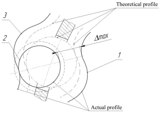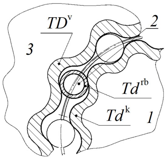 Diagram of the link position in the cycloid tooth system of a transmission with IREFC when manufactured with the maximum possible clearance: 1—cam; 2—intermediate rolling elements; 3—ring.