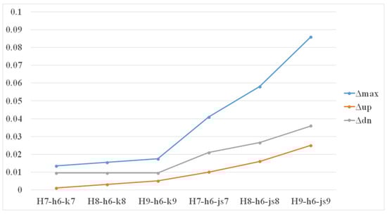 Let us take into consideration several combinations of fits: H-h-k; K-h-h; Js-h-h; H-h-js; K-h-js; Js-h-k. The deviation values will be used for the following diameters: outer profile disk—Ø127.8 mm; rolling elements—Ø18 mm; internal profile disk—Ø82.5 mm. For the considered combinations of fits, the change in the tolerance grade, varying from the 7th to the 9th for cycloid disk fits, has been studied (Table 1).