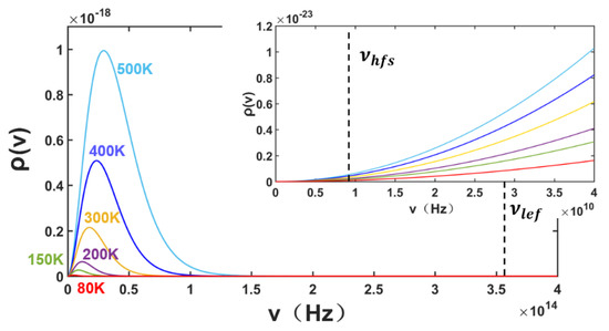 where h is Planck’s constant, c is the speed of light, and is the Boltzmann constant. is the energy density of the BBR field, in J/Hz/m3. BBR exhibits a very broad spectrum at room temperature [15]. Figure 1 shows the relationship between the spectral density of a BBR field and the frequency for several temperatures of the blackbody. The inset shown in Figure 1 is a partial enlargement with frequency in the range of 0 to 4 × 1010. denotes the hyperfine splitting frequency in the ground state, and denotes the lowest allowed electric dipole transition frequency.