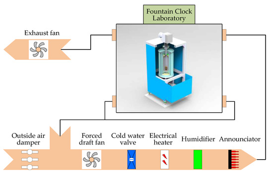 As shown in Figure 2, the temperature of the laboratory where the fountain clock locates is controlled by a two-stage water-cooled air conditioning system, which has a good temperature stability. During the continuous measurements, the temperature fluctuation range is within ±0.5 °C. When the fountain clock physical system was placed directly in the laboratory environment, the temperature of the overall system fluctuated as the laboratory temperature fluctuated, which does not meet the temperature requirements of the system. Overall temperature control is performed on the physical system of the fountain clock, and an insulation layer is installed on the outer wall of the system for temperature control, thereby reducing the temperature fluctuation of the entire physical system.
