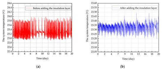 Figure 3 illustrates the physical system temperatures before and after the installation of the insulation layer outside the fountain clock system. Measurements were performed for 20 days for each of the two conditions. Before the insulation layer was added, the temperature fluctuation of the system was 1 °C. After the insulation layer was added, the temperature fluctuation range was limited to within 0.3 °C, indicating greatly improved temperature stability performance of the system.