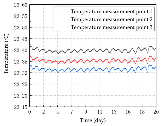 After the temperature system had been improved, when the cesium fountain clock was operating normally and the system temperature had reached equilibrium, we monitored the temperature at the positions of the three Pt100 temperature sensors installed on the outer wall of the vacuum chamber for a long period of time, and obtained the curve of the change in temperature at each measurement point under normal operation (Figure 5 shows the temperature values after deduction of the calibrated deviation).