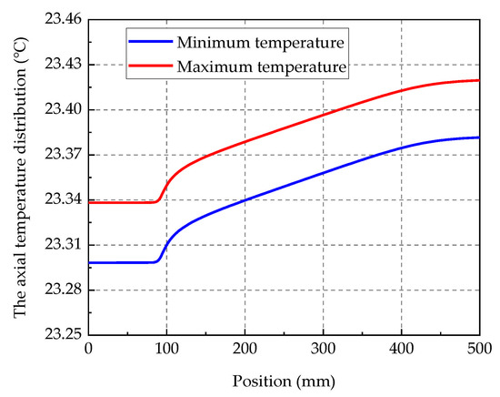 According to the results of the long-term monitoring of the temperature measurement points on the outer wall of the vacuum chamber shown in Figure 5, the temperature distribution of the vacuum chamber gradually increases from bottom to top, and the temperature change trends of the three temperature measurement points are completely consistent. Therefore, we performed only a thermal steady-state analysis of the two conditions of the lowest temperature and the highest temperature on the measurement curve to obtain the temperature distribution range of the resonant cavity and the atomic flight zone. We fixed the temperature for two cases. In the first case, the temperatures of the circumferential surface of the narrow-band vacuum chamber corresponding to temperature measurement points 1, 2, and 3 were set to the lowest temperatures of the temperature curve at the corresponding points, namely, 23.382 °C, 23.337 °C, and 23.296 °C, and a thermal steady-state simulation was performed. In the second case, the temperatures of the circumferential surface of the narrow-band vacuum chamber corresponding to the temperature measurement points 1, 2, and 3 were set to the highest temperatures of the temperature curve at the corresponding points, namely, 23.420 °C, 23.376 °C, and 23.336 °C, and a thermal steady-state simulation was performed. The temperature distribution curve of the central axis of the atomic flight zone in the two cases is shown in Figure 6.
