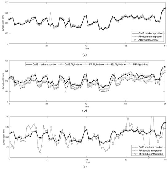 Figure 3a,c, which would improve the accuracy to 1.5 mm and the precision to ±13.9 mm. The flight-time method for all devices except QMS resulted in an underestimation of jump height. The difference was largest for EJ, followed by MP and FP devices.