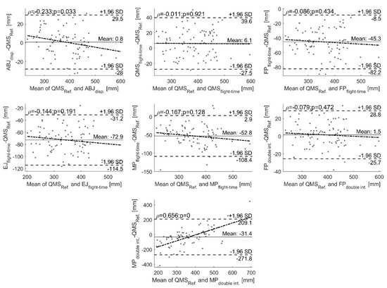 The linear regression line is also shown to investigate the presence of proportional bias. Except for the QMS: flight-time, we observed a significant slope. The Pearson correlation coefficient () and the p-value of the mean variable are also shown. The correlation coefficient revealed a negligible correlation for QMS: flight-time, a moderate correlation for MP: double integration, and a weak correlation for the other cases. The p-value lower than 0.05 was identified for the ABJ: displacement and MP: double integration, meaning the correlation coefficient was statistically significant and, therefore, it is assumed there is proportional bias. The ABJ: displacement presented a negative proportional bias, which would tend to underestimate the jump height for higher jumps. On the other hand, the MP double integration had a proportional bias with a high positive slope, corresponding to a tendency to strongly overestimate the jump height.