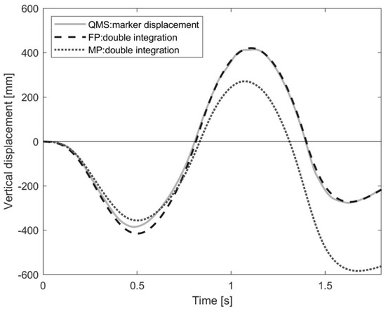 Although the double integration method can provide good accuracy when using ground reaction force data, the same was not observed when using acceleration data collected using the MP device. Analysis of the two vertical acceleration signals, as shown in