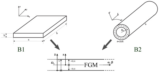 3]. Eliminating this discontinuity and substituting it with a smooth trend is the key achievement of Functionally Graded Materials (FGMs). They are advanced composite materials made by two or more different phases mixed with a continuous graded distribution. As a result, they are heterogeneous materials, delivering optimized responses for each application: the advancements in processing technologies made it possible to control a unidirectional and even multidirectional variation. Combinations of a metallic and a ceramic phase are classic examples of FGMs finding application in severe thermal environments: they overcome the differences in thermal properties of the two constituents and, at the same time, deliver a reduced thermal stress distribution. Stiffness coefficients, hardness, thermal conductivity, moisture diffusivity, and corrosion resistance are just some examples of the performance characteristics that can be combined and enhanced [