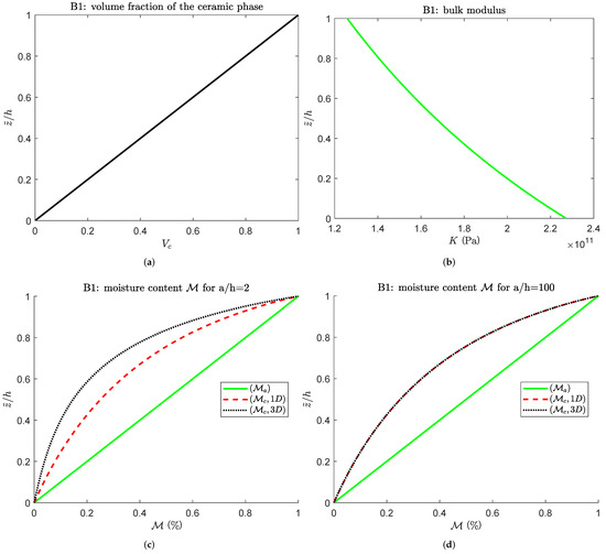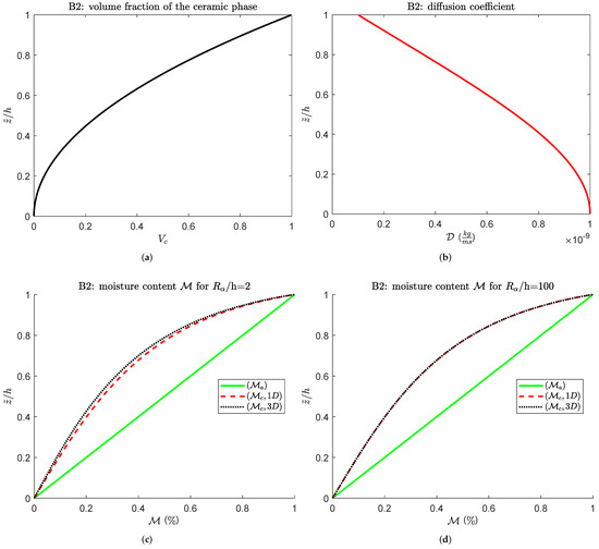 and ranges from 2 to 100 also in this second case study. The material volume fraction of the ceramic phase is a quadratic function of the thickness coordinate; the material law defined through Equation (