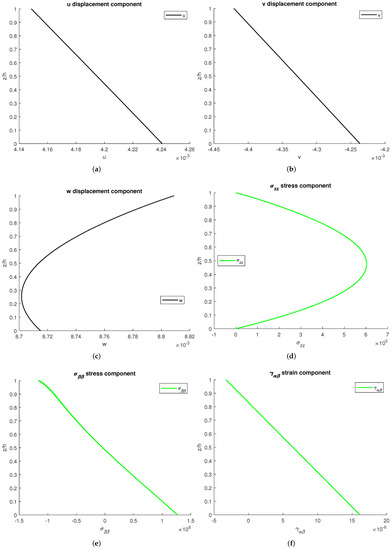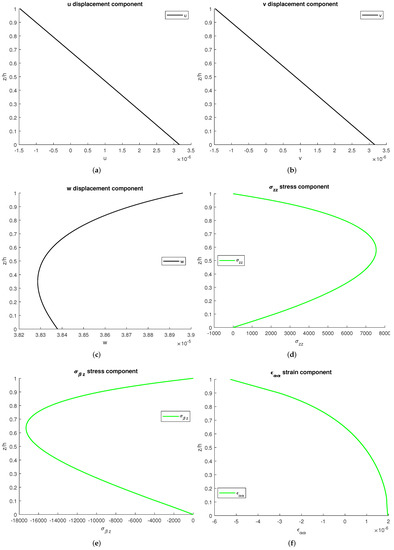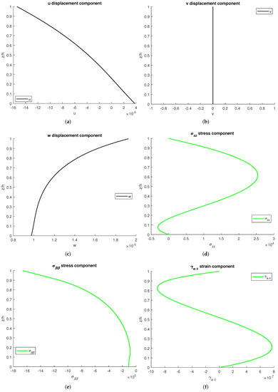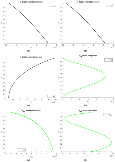 Figure 6 shows the profiles of the tree displacement components: two stresses and a strain. There is continuity in all the plots: this qualifies the correct introduction of the continuity conditions and elastic/hygrometric properties grading. No external mechanical loads are applied, and this is coherent with the transverse stress values at the bottom and top surfaces, 0.