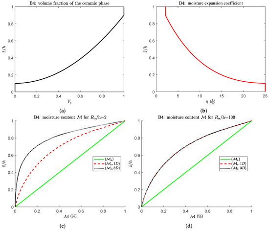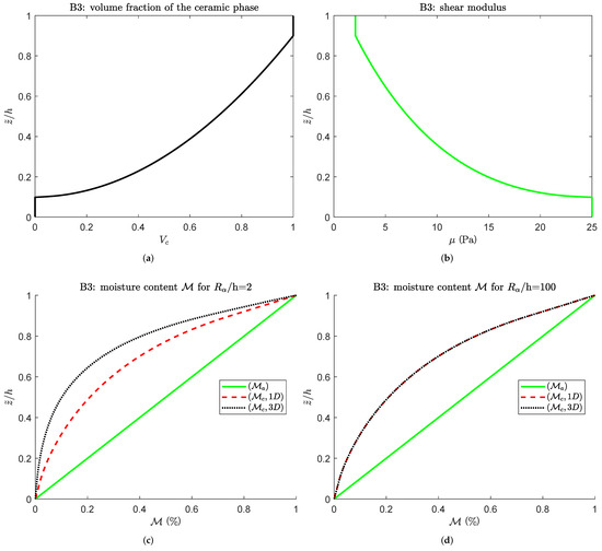 Figure 7c,d compares the three moisture content profiles for a thick and a thin cylindrical shell panel and confirms that the differences are sharp not only at a specific thickness coordinate, but throughout all the thickness. The 3D(