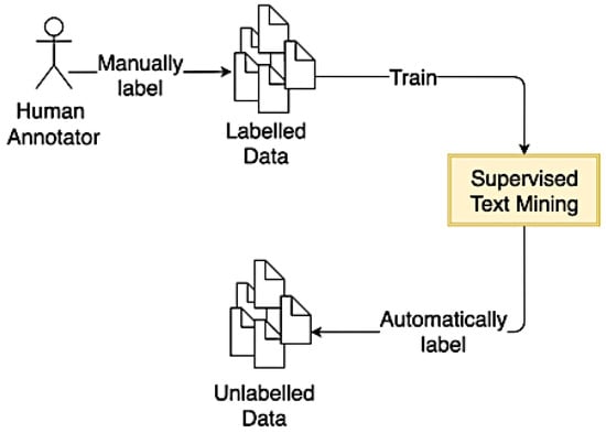 Text-mining algorithms may take one of two broad approaches: supervised [] or unsupervised []. A high-level overview of a supervised text-mining method is illustrated in Figure 1. In a supervised text-mining setting, a human coder is first required to annotate/label manually a sample of the documents against a pre-defined list of categories. The text-mining algorithms are then trained on the manually annotated samples and learn to associate the textual content of a document with its underlying label (e.g., textual content expresses positive/negative sentiment, or relevance to politics/sports/news/technology). Once the training process is complete, the algorithm is used to categorize any unlabeled documents automatically to the same pre-defined list of categories. A supervised algorithm can substantially reduce the time needed to analyze a large document collection, whereby a human coder manually categorizes a sample of the documents (normally a small percentage of the whole data), and the remaining unlabeled ones are automatically categorized by the trained text-mining algorithm [].