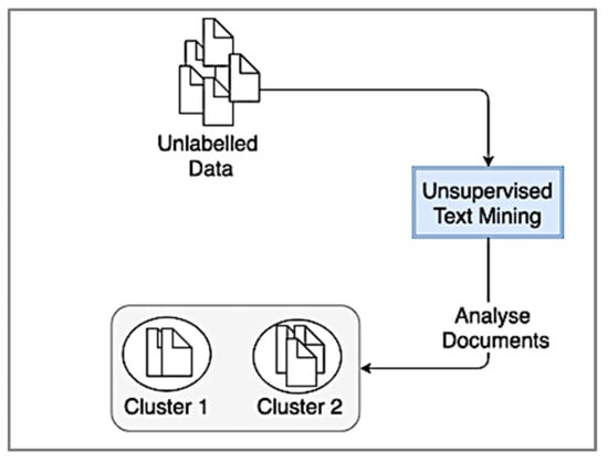 By contrast, unsupervised approaches (illustrated in Figure 2) aim to identify the hidden patterns in a collection of documents (e.g., clusters of semantically similar documents or latent topics) and do not involve a training phase (no need for manual labeling), so can be readily applied to any unlabeled document collection. Unsupervised text-mining methods are widely used to facilitate exploratory analyses of document collections by extracting information that is not immediately evident to experts [,]. For example, the most commonly used unsupervised training approaches use document clustering [] or topic modeling [].