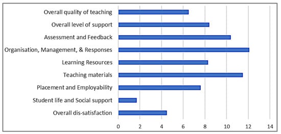 Nevertheless, it is currently widely accepted that the systematic collection and analysis of student feedback constitutes an important quality assurance and enhancement exercise in teaching and learning in higher education. Nationwide student feedback surveys, such as the UK’s National Student Survey (NSS) [], have become the standard in many countries, and their results used to inform the development of improved teaching interventions and practices [,]. The NSS is intended to help students make decisions about where to study and to assist institutions’ planning and quality improvement methods, as well as to offer a measure of public accountability. Despite this systematic collection and analysis of student feedback, the evidence [,] suggests that, over the past decade, there has been only an insignificant increase in overall student satisfaction. This is attributed to the fact that higher education institutions fail to address in a timely manner the negative aspects of students’ learning experiences that are recorded in student satisfaction feedback reports [,].