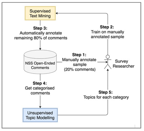 Specifically, the analysis process was broken down into five steps (Figure 4): Step 1 is initiated by a survey researcher manually annotating a small sample of approximately 20% of the NSS open-ended comments, according to pre-defined categories. Step 2 uses the manually annotated samples to train a classification model to ‘learn’ to discriminate between the various categories of problem statement. In Step 3, the trained model automatically annotates the remaining 80% of the dataset’s open-ended comments. In Step 4, an unsupervised topic modeling method automatically identifies the important topics within each problem statement category. Finally, the automatically generated topics are manually inspected and validated, and the results of analysis inform the development of efficient teaching interventions to address the issues raised by the students.