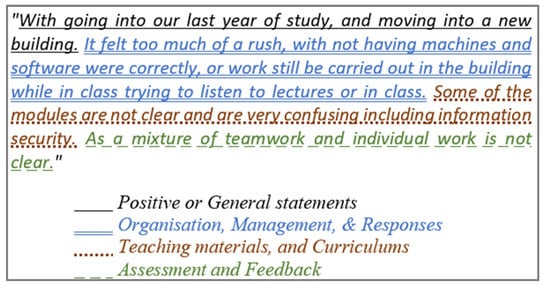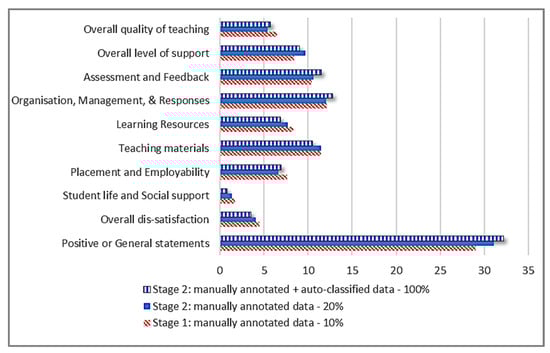 Our annotation scheme (Table 1) provided full coverage of the NSS core questionnaire categories (The NSS questionnaire was revised in 2017, after it was first introduced in 2005. The National Student Survey website (https://www.thestudentsurvey.com, accessed on 20 August 2021) provides only the latest version. The pre-2016 version can be found available online: http://www.bristol.ac.uk/academic-quality/ug/nss/nssqs05-16.html/ (accessed on 20 August 2021)). This is because, upon manually examining 10% of the free-text responses in our NSS dataset (used as case study from a UK university, consisting of 4400 responses 2014–2017), we found that because the NSS questionnaire uses a Likert scale that provides no additional fields for further comments, rather than to discuss new topics the students often used any opportunity for a free-text response to elaborate on their thoughts. We added three additional categories (Categories 6–8) for more specific topics, based on our examination of our NSS dataset, as well as Richardson et al.’s findings []. Although these open-ended questions invited negative comment (positive comments were already covered), we found that a large proportion of responses (29%) were either positive or general, for instance, ‘Overall, it’s been a good course’ or ‘No, negatives at this time’. We considered that this was due to students tending to want to start with a positive statement or perhaps to think that comment was mandatory. Therefore, since we were targeting negative feedback, we created Category 10 for those statements that were nonessential to our study.
