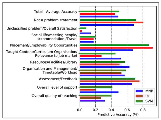 Overall, the SVM algorithm yielded the best average accuracy (50% macro-average across all classes), although its performance improvement over MNB (+1.3%) was low. It should be noted that the accuracy obtained by the three algorithms varied across the 10 problem statement categories. For example, the ‘Placement and employability’ category showed the best predictive accuracy of all the categories with the RF algorithm, achieving a robust performance of 92.5%. The high performance in this category could be explained by the fact that many student responses relevant to ‘Placement and Employability’ contained the word ‘placement’, which was used by the underlying algorithm as a discriminating feature to categorize such problem statements accurately. Two other categories, namely ‘Overall dissatisfaction’ and ‘Student life and social support’, achieved a very low accuracy of approximately 2–14% and 17–20%, respectively, attributed to the limited number of training examples available in these two categories.