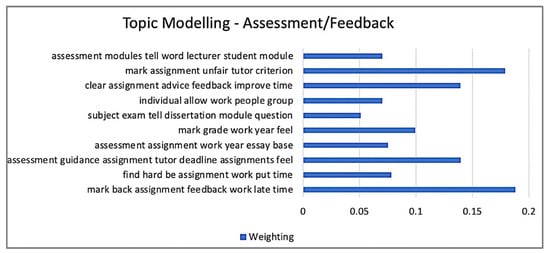 This step automatically lists the important topics among the categorized statements. For each category, we applied the LDA topic-modeling method to summarize the top-10 topics. This generated a hundred topics. For brevity, Figure 8 shows the results for the ‘Assessment and Feedback’ category as an example; the rest are in the Appendix. The first observations were that the topic-modeling method was able to identify thematically coherent topics (with a topic weighting to reflect their relevance) and also represent the underlying category. However, human interpretation was required since each topic was described by a set of seven words, and some topics could be better summarized as a single issue. For example, both Topics 3 and 10 indicated ‘Timely feedback to assessment’; Topics 2, 3, and 8 suggested ‘Clearer assessment criteria’; and Topics 5, 7, 8, and 9 related to ‘Assessment deadlines’.