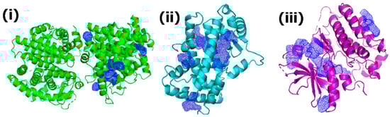 Binding pocket analysis based on POCASA results (i) ERα; (ii) PPAR-α; (iii) EGFR. Shaded blue regions indicate binding pockets.