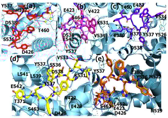 PLIP results with ER-α for (a) Pep; (b) Mut1 (c) Mut2 (d) Mut3 (e) Mut4.