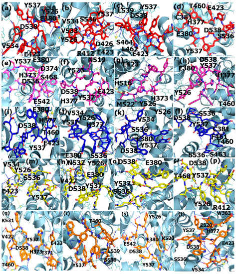 PLIP results for polyphenol peptide conjugates bound to PPAR-α receptor. Pep conjugated with (a) cholorogenate; (b) carnosate (c) gallate (d) rosmarinate. Mut1-conjugated with (e) cholorogenate; (f) carnosate; (g) gallate; (h) rosmairnate. Mut2-conjugated with (i) chlorogenate (j) carnosate; (k) gallate; (l) rosmairnate. Mut 3-conjugated with (m) cholorogenate; (n) carnosate; (o) gallate; (p) rosmairnate; Mut4-conjugated with (q) cholorogenate; (r) with carnosate; (s) gallate; (t) rosmairnate.