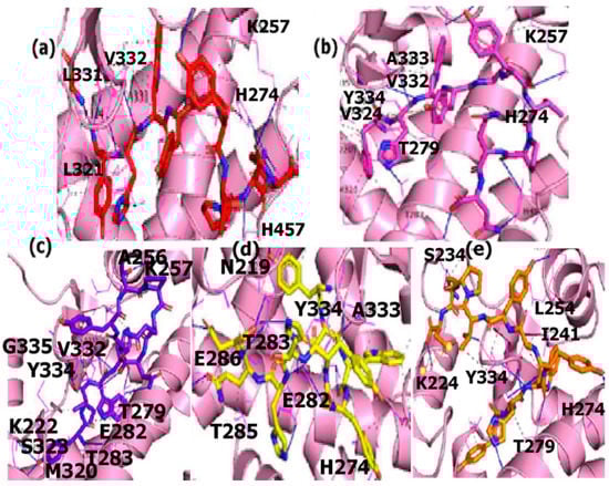 For Mut1 (Figure 4b and Supplementary Information Table S4b), thirteen hydrophobic interactions, twelve H-bonds, and a π-stacking interaction with Tyr334A were observed. New hydrophobic interactions were observed with Thr283A, Met320A, and Val324A, while new H-bonds occurred with Leu254A, Thr283A, and Thr285A. For Mut2, extensive hydrogen bonding (fourteen) and hydrophobic interactions (eleven) were observed compared with Pep, and a π-stacking interaction with Tyr334A was again observed, as shown in Figure 4c and Supplementary Information Table S4c. New hydrogen bonds occurred with Tyr214A, Lys222A, Leu254A, and Ser323A, while new hydrophobic interactions were seen with Glu282A, and Met320A. Mut3 (Figure 4d and Supplementary Information Table S4d) exhibited thirteen hydrophobic interactions and sixteen H-bonds. New hydrophobic interactions occurred with Val255A, Thr283A, Thr285A, Glu286A, Glu289A, and Val324A, while new H-bonds occurred with Asn217A, Asn219A, Met220A, Glu282A, Thr283A, Glu286A, and Glu289A. Mut4 (Figure 4e and Supplementary Information Table S4e), displayed ten hydrophobic interactions and ten hydrogen bonds. New hydrophobic interactions were observed with Lys224A, Asn236A, Leu254A, and Val324A and new H-bonds were seen with Lys224A, Ser234A, Thr253A, and Thr283A. A salt bridge was formed with Lys224A.