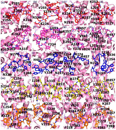 CGAMut3 (Figure 5m and Supplementary Information Table S5m), showed ten hydrophobic interactions including new ones with Lys224A, Ile228A, Leu254A, Val281A, and Glu282A. Eleven hydrogen bonds were seen, new ones occurring with Ser234A, Cys257A, Asn226A, His457A, and Arg692B. The CSAMut3 conjugate shown in Figure 5n and Supplementary Information Table S5n, exhibited twelve hydrophobic interactions, including those with Asn219A, Lys224A, Val227A, Ile228A, Asn236A, and Lys257A. Eight H-bonds were seen, π-stacking was once again seen with Tyr334A, and a π-cation interaction with Lys224A was observed. GLAMut3 (Figure 5o and Supplementary Information Table S5o), showed only six H-bonds with His274A, Thr279A, Glu282A, Thr285A, His457A, and Arg692B. Of the total of nine hydrophobic interactions, new ones were seen with Lys257A, Thr279A, Val281A, Glu282A, His457A, and Leu 693B. π-stacking was observed with His274A and a salt bridge was observed with Arg692B. RMAMut3 (Figure 5p and Supplementary Information Table S5p) displayed eleven hydrophobic interactions, including new ones with Leu254A, Lys257A, Leu258A, Thr279A, Val281A, and Glu282A. Thirteen H-bonds were shown, including new ones with Ala250A, Ala256A, Lys257A, Thr283A, Thr285A, His457A, and Arg692B. Three π-stacking interactions were seen with Tyr334A and one with His457A, while a salt bridge was formed with Arg692B.
