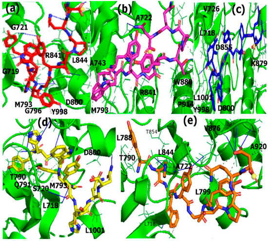 PLIP results for each of the peptides docked with EGFR are shown in Figure 6 and detailed interactions are indicated in Supplementary Information Table S6. Eight hydrophobic interactions and nine hydrogen bonds were predicted, according to PLIP as shown in Figure 6a and Supplementary Information Table S6a. Mut1, as indicated in Figure 6b and Supplementary Information Table S6b, showed comparatively lower (six) hydrophobic interactions and six H-bonds, as well as a salt bridge with Lys745A. Hydrophobic interactions with Asp800A, Arg841A, and Leu844A that were seen for Pep were still observed, while new ones were formed with Leu718A and Gly719A. Hydrogen bonds with Lys745A and Asp800A were likewise maintained, while new H-bonds were seen with Met793A, Gly796A, Asp855A, and Asn996A. Mut2 (Figure 6c and Supplementary Information Table S6c) displayed eleven hydrophobic interactions and ten hydrogen bonds as well as a salt bridge with Lys745A. New hydrophobic interactions formed compared to Pep included those with Leu718A, Gly719A, Met793A, Glu804A, Thr854A, Asp855A, and Leu1001A. New hydrogen bonds included those with Leu718A, Ser720A, Met793A, Asn842A, Thr854A, Asp855A, and Asn996A. Mut3, as seen in Figure 6d and Supplementary Information Table S6d exhibited only two hydrophobic interactions and five hydrogen bonds while for Mut4, six hydrophobic interactions and four hydrogen bonds were predicted, along with a salt bridge with Asp800A, as shown in Figure 6e and Supplementary Information Table S6e. Hydrophobic interactions occurred with Val726A, Leu844A, and Leu1001A, while H-bonds were shown with Lys745A, Arg803A, Asp855A, and Lys913A.