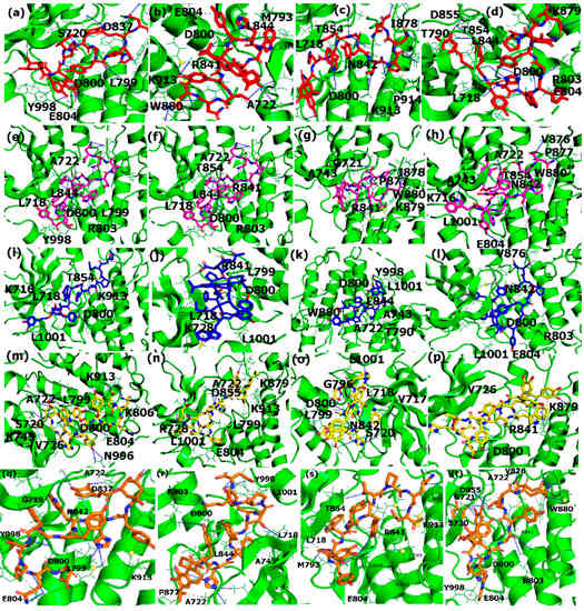 CGAMut3 exhibited seven hydrophobic interactions and ten hydrogen bonds were observed, as well as a salt bridge with Arg841A, indicated in Figure 7m and Supplementary Information Table S7m. Compared to Mut3 alone, new hydrophobic interactions were observed with Leu718A, Gly719A, Ser720A, Leu799A, Asp800A, and Asn996A. New H-bonds were seen with Ser710A, Ala722A, Lys745A, Asp800A, and Asn996A. As seen in for CSAMut3 (Figure 7n and Supplementary Information Table S7n), ten hydrophobic interactions, eight hydrogen bonds, and one π-stacking interaction were seen. New hydrophobic interactions included those with Ala722A, Val726A, Leu844A, Thr854A, Val876A, Ile878A, and Trp880A, while new H-bonds included those with Lys745A, Arg841A, Val876A, Lys879A, Ile918A, and Ala920A. The GLAMut3 conjugate, as indicated in Figure 7o and Supplementary Information Table S7o, showed nine hydrophobic interactions and eight hydrogen bonds. New hydrophobic interactions included those with Leu718A, Val726A, Asp800A, Leu844A, and Trp880A, while new hydrogen bonds were seen with Leu718A, Asp800A, and Arg841A. RMAMut3 (Figure 7p and Supplementary Information Table S7p) showed seven hydrophobic interactions, including new ones with Leu718A, Gly719A, Leu799A, Asp800A, Lys879A, and Trp880A. Eight H-bonds, including new ones with Val717A, Gly719A, Ser720A, and Val876A, were formed.