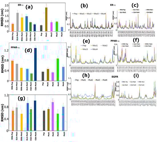 Comparison of RMSDs (72 ns–100 ns). (a) ERα; (d) PPARα; (g) EGFR. RMSFs for the entire 100 ns runs are shown for each of the receptors with (b) and (c) corresponding to ERα; (e,f) corresponding to PPARα; (h,i) corresponding to EGFR.