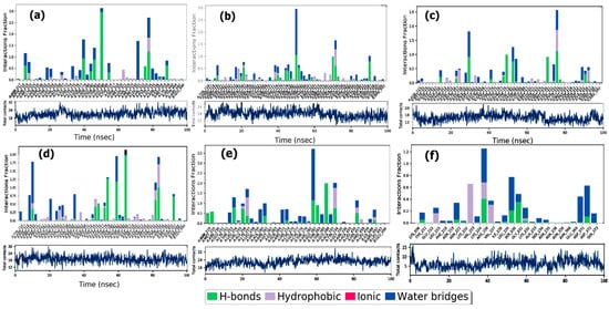 Following docking, the PLIP interface was used to study the interactions. Results for ER-α with peptides are shown in Figure 2 and Supplementary Information Table S2. As shown in Figure 2a, and Supplementary Information Table S2a, Pep exhibited eighteen hydrogen bonds and eight hydrophobic interactions with ER-α. Additionally, a π-stacking interaction between Tyr537A and Tyr6 of Pep, as well as salt bridges between His516D and Lys520D and the carboxy-terminal of Pep, were observed. Tyr537 is a critical residue in the binding pocket of ER-α that plays an important role in hormone binding and DNA binding and is essential for the conformational changes that occur within the receptor to activate downstream transcription processes [57]. This indicates that Pep interacts within the same region.