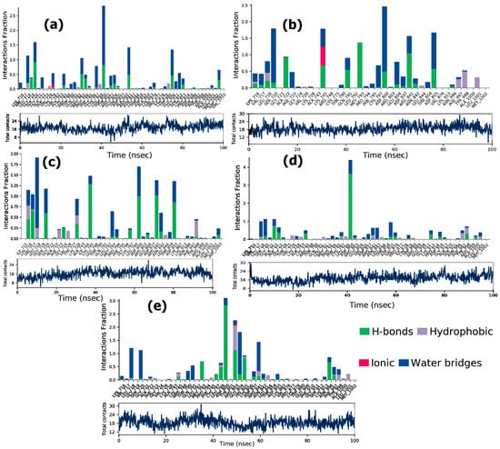 PLIP results for each of the peptides bound to PPARα receptor. (a) Original peptide; (b) Mut1 (c) Mut2 (d) Mut3 (e) Mut4.