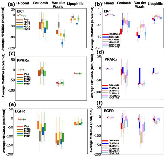 From the data obtained from Autodock Vina, for ER-α, RMAMut1 (rosmarinic acid conjugated to Mutation 1 peptide); CGAMut4 (chlorogenic acid conjugated to Mutation 4 peptide), and GLAMut4 (gallic acid conjugated to Mutation 4 peptide) were found to have the highest binding affinities. According to FireDock results, the highest global energies were found to be for GLAMut4, followed by CSAMut2 (carnosic acid conjugated to Mutation 2 peptide) and CGAMut3 (chlorogenic acid conjugated to Mutation 3 peptide). These results indicate that conjugating with certain polyphenols likely increases the binding affinity of the ligands toward ER-α. For PPAR-α, the binding affinities were found to be relatively lower than the results obtained for ER-α. This is plausible due to differences in the binding pockets and their interactions with each of the ligands. Nevertheless, the highest binding affinity for PPAR-α according to Autodock Vina was seen for RMAMut1, followed closely by GLAMut3 and RMAPep. Based on FireDock results, the highest global energy was found to be for CSAMut1, followed by CSAMut3 and GLAMut1. For the EGFR receptor, based on Autodock Vina results, the highest binding affinity was observed for pep at −9.5 kcal/mol, though this was lower than that observed for the ER-α (−10.0 kcal/mol). The second-highest binding affinity was observed for RMAMut1, followed by CSAMut3. As per FireDock results, the highest global binding energy was found to be for RMAMut4 followed by CSAMut3 and GLAMut3. For PPAR-α, the point mutation of Tyr in position 1 to Phe improved binding affinity from −8.9 kcal/mol to −9.1 kcal/mol according to Autodock Vina results, whereas very marginal reduction was observed according to FireDock (−49.68 to −49.55 kcal/mol), indicating that Mut1 may potentially exhibit high binding affinity for PPAR-α. Mut4 and Mut3 exhibited the second and third highest global binding energy according to FireDock and a high binding affinity according to Autodock Vina as well, indicating that these peptides may have a fairly high binding affinity with PPAR-α. Thus, while there were some similarities in the results obtained from FireDock and AutoDock Vina, the results overall showed a selection of different compounds for each of the receptors. Given the variance in results based on the individual analysis of global energy as seen in the case of FireDock or estimate of free binding energy (kcal/mol), as seen in Autodock Vina, it is indicative that the software had dissimilarities between best proposed candidates. This is likely due to differences in the docking algorithms [55]. FireDock provides results from the global binding energy and takes into account electrostatic, Van der Waals, H-bond, and atomic contact energies. Autodock Vina uses a combination of knowledge-based and empirical scoring functions and is the summation of ∆G gauss, ∆Grepulsion, ∆GHbond, ∆Ghydrophobic, and ∆Gtors, which is proportional to the number of rotatable bonds [56]. Overall, based on both docking programs, our results indicated that the conjugates, as well as the peptides, had moderate to good binding affinities, with relatively higher binding affinities observed for ER-α and EGFR receptors compared to PPAR-α.