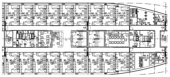 HANNARA is a Korean Maritime and Ocean University student training ship. Figure 2 depicts the layout of the HANNARA ship’s student living quarters. The purpose of showing a plan of the HANNARA is that the ship environment is similar to that of a cruise ship, and there are enough persons on board as well. In addition, the ship has many stateroom structures similar to those on a cruise ship. It is possible to demonstrate the natural application environment of proximity detection to the maximum extent. The HANNARA ship is used as an experimental environment for this study in subsequent research. As shown in Figure 2, the vessel is compact, and proximity detections of less than 6 ft are more likely in this context. Due to the fact that ship space is restricted, the passengers onboard must engage in a full range of activities. Socialization distances of less than 6 ft and duration of more than 15 min are more frequent in this instance. As a result, one of the most critical aspects of locating close relationships is accurately calculating proximity detection of ship riders.