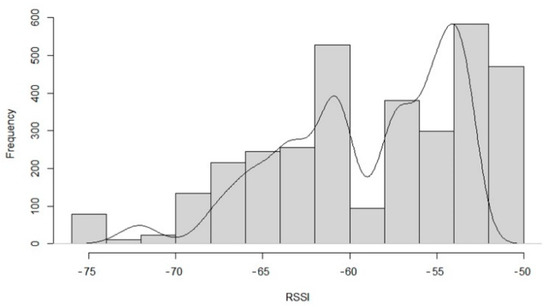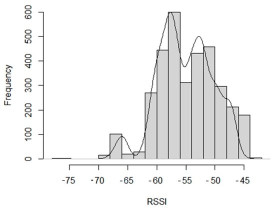 Due to propagating effects, such as reflection, diffraction, and dispersion caused by dense multipath and indoor environments, it is challenging to predict radio frequency (RF) signal variations [28]. The multi-path fading effect results from a constructive or destructive combination of multiple signal copies at the receiver, causing the signal received to fluctuate in a particular area around the mean value [29]. In the case of large-scale decreases and small-scale declines, the received signal is generally modeled [30]. Note that the measurements average small-scale fading results when RSSI is average [31]. However, these results do not consider an in-depth analysis of RSSI distribution.