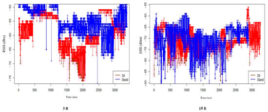 Figure 6 shows the variation of RSSI for two different poses of 3 ft and 15 ft. The measurement is performed over a continuous period of 3 min on different distances and poses. The RSSI range difference of sitting and standing poses is evident at 3 ft. However, it is not distinct at 15 ft—the RSSI of sitting and standing at 15 ft stabilized in a similar range. The RSSI of sitting and standing postures is clearly distinguished at 3 ft. RSSI content is almost identical with different poses at 15 ft. The RSSI of stand poses fluctuates mainly between −50 dBm and −55 dBm in the range of 0 to 1000 in the horizontal coordinate of 3 ft. In that range, the RSSI fluctuation interval of the sitting poses is two: One is in the horizontal coordinate of 0 to 500 range where the RSSI fluctuation interval is −55 dBm to −70 dBm. The other is in the horizontal coordinate of the 500 to 1000 range; the RSSI fluctuation interval is −50 dBm to −55 dBm. That is to say that in a specific time range of a close distance case, there is a significant difference in RSSI for various poses, and in the long-distance case, this difference gradually decreases. From the above analysis, we conclude that as distance increases, the difference in RSSI at various poses gradually decreases. Mean and skewness features for distinguishing different poses gradually disappear. In the case of close distance, the RSSI of different poses have various fluctuation intervals in different periods.