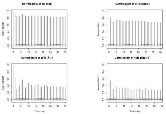 Correlograms of RSSI (3 ft and 15 ft, Sit and Stand).