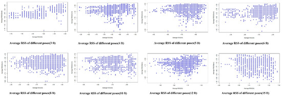 Figure 8 shows two-dimensional plots of RSSI patterns from different poses at the same distance. The x-axis represents the RSSI of the sitting posture. The y-axis represents the RSSI of the standing posture. Note that the pattern of RSSIs of different poses cannot be grouped into clusters. The degree of separation does not increase as distance changes from 3 ft to 15 ft at different poses. This observation suggests that signals with more significant standard deviations (or variance) will make it more challenging to perform proximity detection. The 3-feet distance, as shown in Figure 9, has a substantially more distinct patterns than the other lengths. As a result, RSSI data from sitting and standing poses may be combined to obtain a 3-feet distance marker. On the other hand, the different distances produce no discernible pattern change. The RSSs of the sitting and standing poses for the 3-feet distance is closer simultaneously, but the RSSs of the two poses for the other ranges are further away.