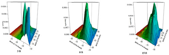 Three-dimensional density plots of RSSI with 3 ft, 8 ft, and 15 ft.